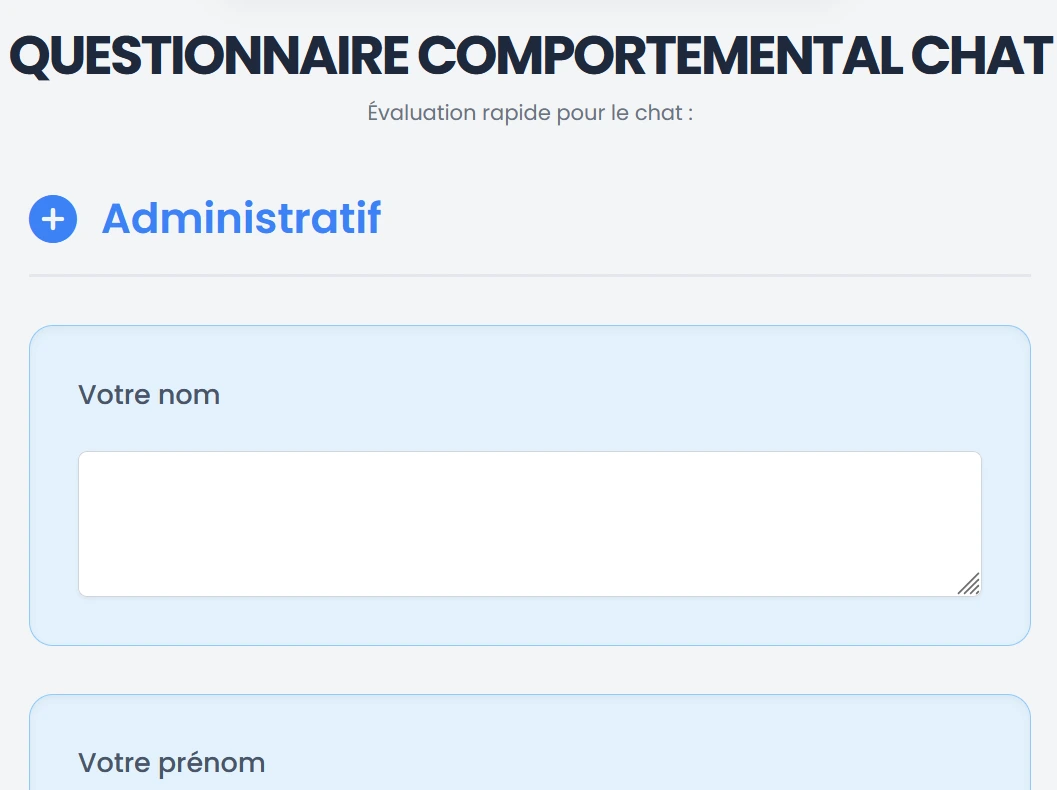 Le questionnaire a été créé par Gaël Didier, comportementaliste félin (6 formations agréées, auteur reconnu). Mis à jour régulièrement selon la veille scientifique. Le rapport est modifiable par vos soins (PDF et Word).